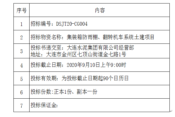 2.項目說明:大連水泥集團有限公司組織對大連水泥廠2#鋼倉北側(cè)新建兩條水泥集裝箱系統(tǒng)防雨棚、2#鋼倉北側(cè)水泥集裝箱翻轉(zhuǎn)機裝車系統(tǒng)土建、3#、4#庫側(cè)水泥集裝箱防雨棚項目項目進行邀請招標(biāo)。凡接到本招標(biāo)邀請的廠商均可參加投標(biāo)。